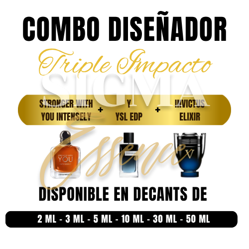 El combo Triple Impacto es la máxima expresión del triunfo en la perfumería moderna, una selección diseñada para elevar el ADN de la seducción a un nivel de intensidad sin precedentes. Esta tríada, compuesta por stronger with you intensely, ysl edp, invictus victory elixir, captura la frescura del éxito y le añade una profundidad oscura, densa y magnética. Es una composición creada para el hombre que no solo compite, sino que domina, ofreciendo una estela potente que declara su presencia antes de que diga una sola palabra. Ahora disponibles en decants desde 2 ml hasta 50 ml, para que el poder de la victoria te acompañe en cualquier formato.