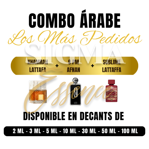 El combo árabe los más pedidos reúne a khamrah, 9pm, sublime, las fragancias más virales y potentes de la perfumería actual. Disponibles en decants de 2 ml a 50 ml, este trío ofrece versatilidad, lujo y una duración extrema para cualquier ocasión. Es la oportunidad perfecta para poseer los aromas más deseados del mundo en formatos adaptados a tu estilo de vida.