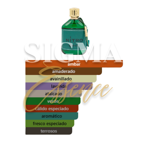 Finalmente, Nitro Green se asienta sobre una base rica de vainilla negra, ámbar y cedro. La vainilla dominante crea una capa de magnetismo persistente que dura muchas horas en la piel, asegurando una estela dulce pero con una fijación envidiable que, gracias a su concentración, supera las expectativas de rendimiento. Simultáneamente, el toque amaderado aporta una estructura sólida y una masculinidad robusta que evita que el dulzor sea excesivo. En conclusión, esta base es la responsable de la excelente duración y la proyección radiante que caracteriza a esta creación. Gracias a su equilibrio, es una fragancia perfecta para conquistar la noche, citas especiales y eventos donde quieras ser el centro de atención.